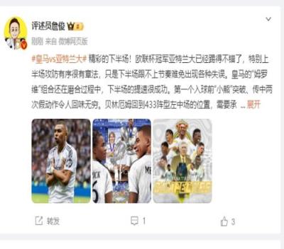 詹俊:精彩的下半场!欧联杯冠军亚特兰大已经踢得不错了,特别上半场攻防有序很有章法,只是下半场跟不上节奏难免出现各种失误。皇马的“姆罗维”组合还在磨合过程中,下半场的提速很成功。第一个入球前“小熊”突破、传中两次假动作令人回味无穷。贝林厄姆回到433阵型左中场的位置,需要承担更多防守任务,继续有靓丽表现。