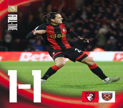 体育资讯12月17日报道宣称 英超第16轮全部战罢,伯恩茅斯1-1战平西汉姆之后,升至英超第6位。