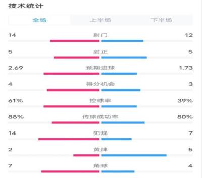 AC米兰32帕尔马全场数据:射门1412,射正55,控球率61%39%