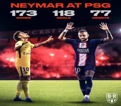 7年前的今天:内马尔巴黎首秀传射,共计173场118球77助攻+14冠