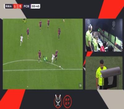 体育资讯01月13日报道宣称 西超杯决赛,皇马对阵巴萨。54分钟,姆巴佩单刀被铲倒,裁判一开始吹罚越位。
