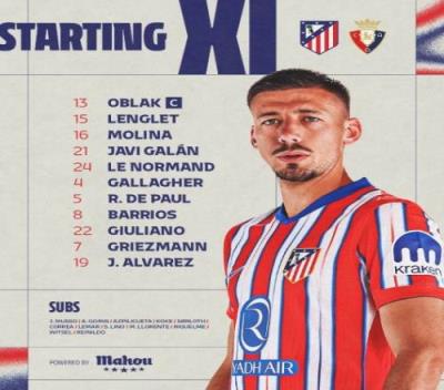马竞VS奥萨苏纳首发:阿尔瓦雷斯&勒诺尔芒出战,索尔洛特替补