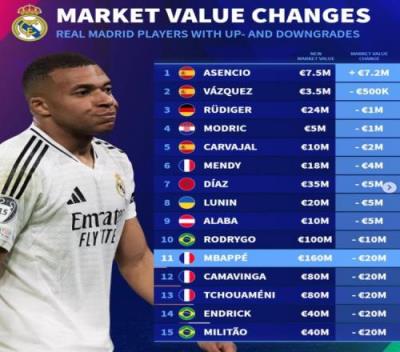 德转列皇马身价变动:仅小将劳尔上涨,姆巴佩等5将下跌2千万欧