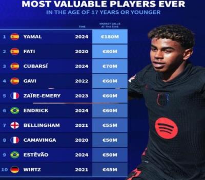 德转列U17历史身价榜:亚马尔1.8亿居首,法蒂2020年8000万欧