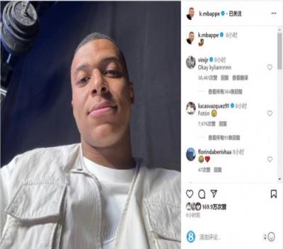 姆巴佩社媒晒自拍照,维尼修斯、卡马文加、福登等人点赞