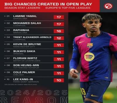 五大联赛运动战创造重大机会榜:亚马尔、萨拉赫17次并列居首