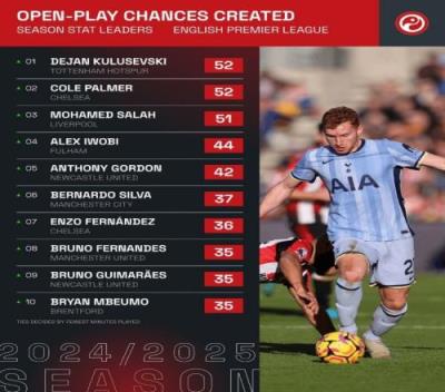 本赛季英超运动战创造机会榜:库卢&帕尔默52次,萨拉赫51次