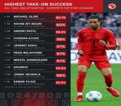 五大联赛过人成功率榜:拜仁曼城各2将,亚马尔未上榜