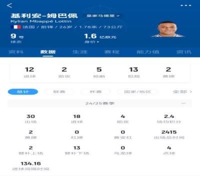 体育资讯01月20日报道宣称 皇马4-1完胜拉斯帕尔马斯,姆巴佩梅开二度,打入代表皇马的第17球和第18球,达成这一数据,姆巴佩用了30场比赛。