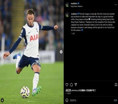 体育资讯8月20日报道宣 在今天凌晨结束的英超首轮比赛中,热刺1-1战平莱斯特城。本场比赛,蓝狐旧将麦迪逊送出1次助攻,但没能帮助热刺取胜。赛后,他更新了社媒,展望了新赛季,也感谢了莱斯特城。