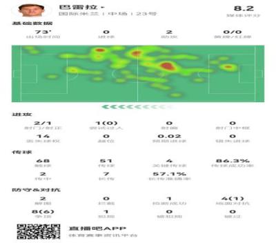 巴雷拉本场2助攻+4关键传球7长传4成功12对抗7成功获评8.2分