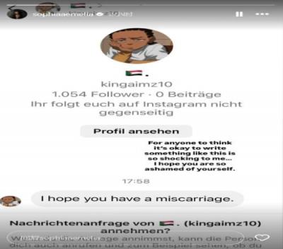 索菲娅发出了自己收到的私信,有球迷诅咒她:“我希望你流产。”还有球迷人身威胁索菲娅:“我要去你家杀了你的孩子。我不是在开玩笑,你等着吧。”
