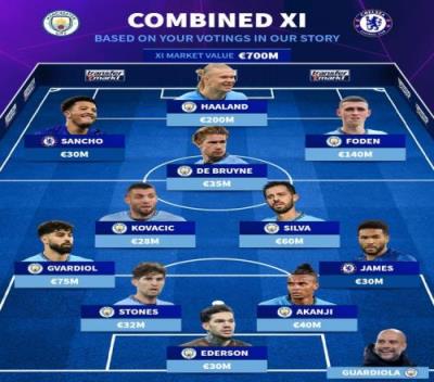体育资讯1月25日报道宣称 北京时间明天凌晨1点30分,曼城将在英超第23轮比赛中主场对阵切尔西。德国转会市场根据球迷的投票列出了两队合体阵容,切尔西仅2名球员入选。