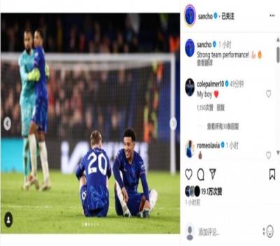 赛后布伦特福德球员与切尔西球员发生大规模争执,不过桑乔与帕尔默气定神闲坐在场上聊天。桑乔社媒晒出两人聊天合照,配文写道:“出色的球队表现!”帕尔默则回复到:“我的兄弟♥️”