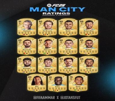 FC25曼城部分球员总评:哈兰德91居首,德布劳内、罗德里90