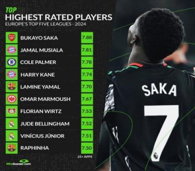 新世代!2024五大联赛场均评分:萨卡压帕尔默居首,28岁+仅凯恩