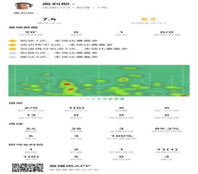 体育资讯8月3日报道宣称 法国在奥运男足八强战1-0淘汰阿根廷,拜仁边锋奥利斯本场数据如下: