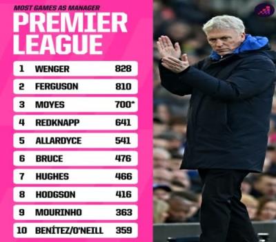 英超教练带队场次榜:温格、弗格森前2,莫耶斯700场第3,穆帅第9