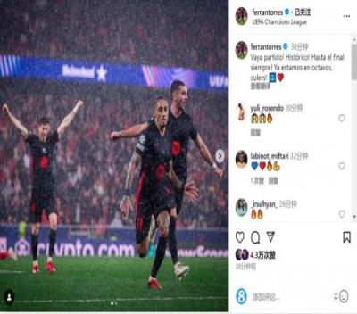 赛后费兰-托雷斯晒出庆祝的照片,配文:“多么精彩的比赛!历史性的一役!永远拼到最后!我们已经进入16强,巴萨球迷们!”