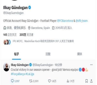 体育资讯8月18日报道宣 今天凌晨,巴萨在西甲揭幕战取得胜利,京多安赛后发文庆祝。