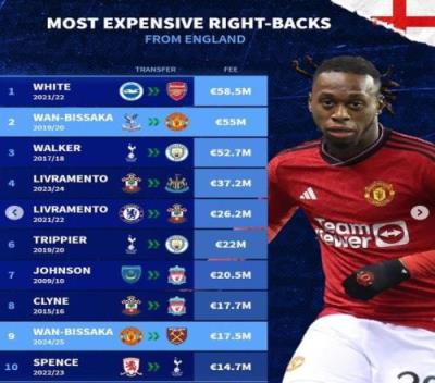 英格兰右后卫转会费榜:本怀特、沃克在列,万比萨卡两上榜