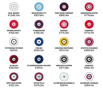 俱乐部收入排行榜:皇马超10亿历史首队曼城巴黎曼联拜仁前5