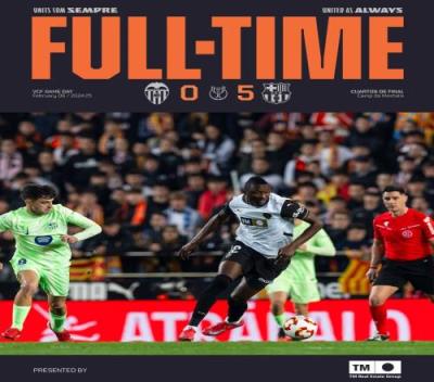 体育资讯02月07日报道宣称 国王杯1/4决赛瓦伦西亚0-5惨败给巴萨,这是球队10天内的第二次惨败,上一次1-7惨败也是输给巴萨。