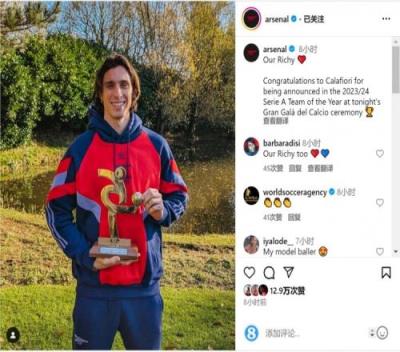 阿森纳官方社媒晒出卡拉菲奥里领奖的照片,并写道:“祝贺卡拉菲奥里入选意大利球员协会2023-2024赛季意甲最佳阵容。”