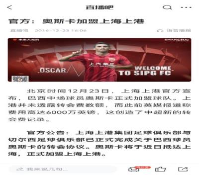 1-奥斯卡,6000万欧元,16/17赛季,切尔西→上海上港