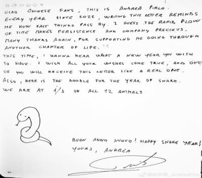 体育资讯1月28日报道宣称 新春佳节之际,AC米兰名宿皮尔洛手写拜年信,向中国球迷送上祝福。