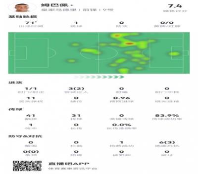 体育资讯1月23日报道宣称 正在进行的欧冠,皇马主场4-0领先萨尔茨堡红牛。此役姆巴佩首发71分钟被换下,球员全场重点数据如下↓