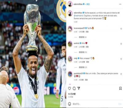 他也晒出自己头顶欧超杯的照片,并配文道:“特别的夜晚,为皇马历史又添一座冠军。很自豪也很荣幸成为其中的一部分,这也为新赛季开了个好头!”