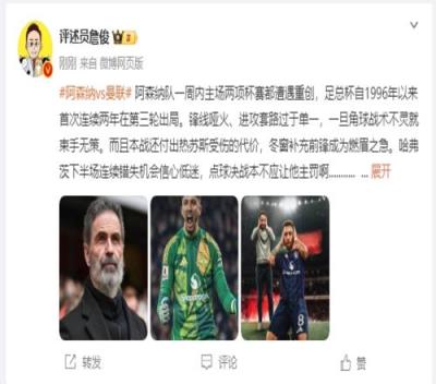 体育资讯01月13日报道宣称 本轮足总杯,曼联120分钟1-1战平阿森纳,点球战曼联取胜。赛后,评述员詹俊发文。