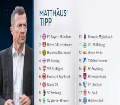 体育资讯8月21日报道宣 近日,拜仁名宿马特乌斯预测了新赛季德甲的最终排名,他预测拜仁会夺得冠军。