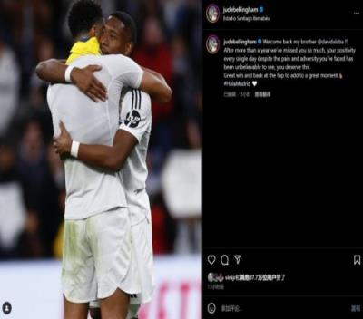 贝林晒出和阿拉巴相拥的照片,并写道:“欢迎回归,我的兄弟!一年多以来,我们非常想念你。尽管面对着痛苦和逆境,但你每天都保持着积极的心态,这真是令人难以置信,你值得这一刻。”