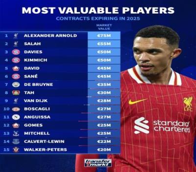 体育资讯2月4日报道宣称 五大联赛转会窗口已经正式关闭,德国转会市场统计了合同将在本赛季结束后到期球员的身价榜,其中,阿诺德、萨拉赫前二,阿方索和基米希并列第三,德布劳内、范迪克进入前十。