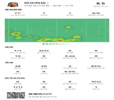体育资讯1月30日报道宣称 巴黎在本轮欧冠4-1领先斯图加特,巴尔科拉本场数据如下: