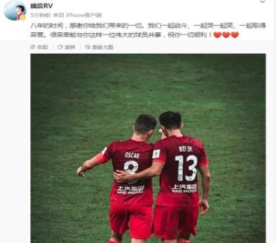 体育资讯12月26日报道宣称 今天一早,海港球员魏震更新社媒,向已经离队的奥斯卡告别。
