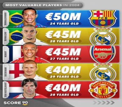 1.罗纳尔迪尼奥(巴萨/巴西/24岁)5000万欧