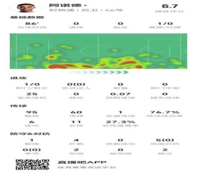 阿诺德全场数据:5次地面对抗&6次传中均未成功,11次长传成功3次