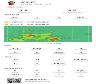 萨利巴全场数据:1进球2解围1拦截&传球成功率94.4%,评分7.8