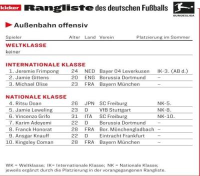 体育资讯1月6日报道宣称 德媒《踢球者》评选了德甲半程边锋评级,弗林蓬、吉滕斯、奥利塞领衔,堂安律位列第4。