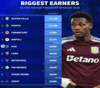 体育资讯2月5日报道宣称 五大联赛已经关窗,《转会市场》也统计了今年冬窗各队收入情况,维拉力压波尔图居首。