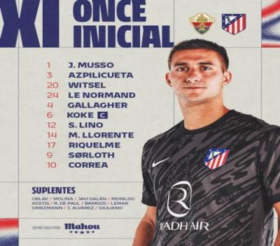 马竞首发:穆索、阿斯皮利奎塔、维特塞尔、勒诺尔芒、加拉格尔、科克、利诺、略伦特、里克尔梅、索尔洛特、科雷亚