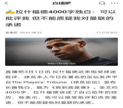 今年3月,拉什福德在曼联也遭遇过类似的情况,当时他也因表现不佳遭到批评。而他在The Players'Tribune发布了长篇文章,他在文章中表示,他可以接受批评和流言蜚语,但不能质疑他对曼联的承诺。