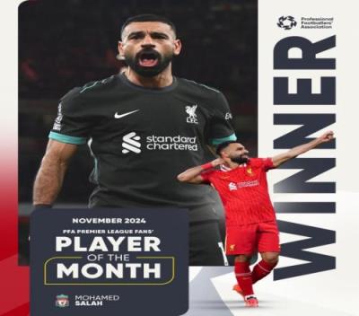 萨拉赫11月为利物浦出战3场英超比赛,打进4球并送出1记助攻。PFA官方晒出萨拉赫的海报,确认他在球迷投票中胜出,当选PFA英超11月最佳球员。