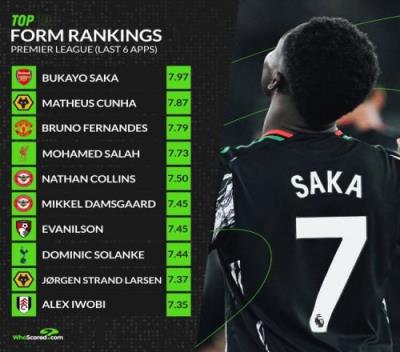 whoscored当前英超状态榜:萨卡压库尼亚居首,B费、萨拉赫列三四