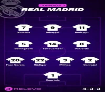 Relevo预测皇马次轮首发:1-库尔图瓦、2-卡瓦哈尔、3-米利唐、22-吕迪格、20-弗兰-加西亚、8-巴尔韦德、14-琼阿梅尼、5-贝林厄姆、11-罗德里戈、9-姆巴佩、7-维尼修斯
