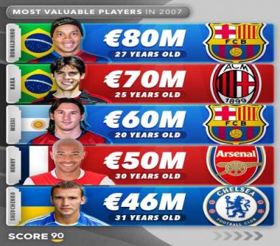 2007年以来历年身价最高球员:小罗梅罗姆巴佩维尼修斯