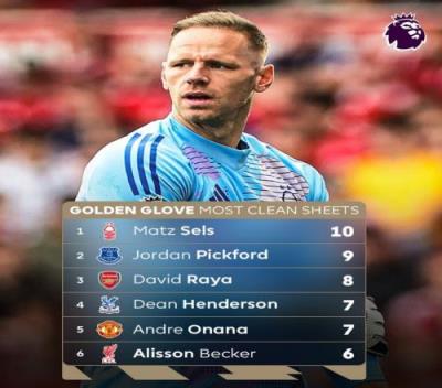 体育资讯2月8日报道宣称 英超官方盘点了本赛季门将零封场次榜,其中诺丁汉森林门将塞尔斯10场居首,以下为具体榜单: